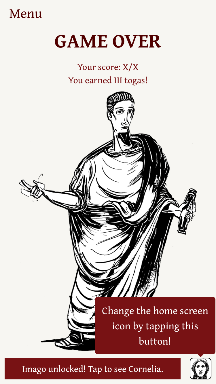 A fun little feature that I added recently to the iOS version of Vice Verba is the ability to set the home screen app icon to one of the imagines that you’ve unlocked. Here’s now the new UI looks at the end of a round when you’ve unlocked an imago, and also in the imagines view where you can see all your unlocked imagines: